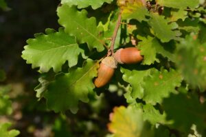 La roverella (Quercus pubescens) è una quercia decidua molto rustica, capace di colonizzare ambienti aridi, pendii assolati e suoli poveri, dove altre piante faticano a crescere. Proprio questa sua resistenza la rende una presenza chiave negli ecosistemi forestali dell’Italia centro-meridionale. Il suo tronco è generalmente diritto, ma può diventare contorto negli individui più vecchi o esposti a vento e siccità. La corteccia, grigio-bruna e profondamente solcata, si ispessisce con l’età e costituisce una protezione efficace contro le alte temperature e gli incendi superficiali. La chioma è ampia e irregolare, spesso espansa lateralmente, in grado di offrire un’ombra fitta e preziosa nei mesi estivi. Le foglie sono una delle caratteristiche più riconoscibili: lobate, simili a quelle della farnia, ma ricoperte da una sottile peluria, soprattutto sulla pagina inferiore e sui giovani germogli. Tale pubescenza – da cui deriva il nome della specie – riduce la perdita d’acqua e rappresenta un efficace adattamento alla siccità. In autunno assumono tonalità giallo-brune e spesso restano secche sui rami per buona parte dell’inverno. Le ghiande, raggruppate anche a 3-4 su un breve peduncolo, sono una risorsa alimentare fondamentale per numerosi animali selvatici, come cinghiali, ghiandaie e roditori. Questa quercia, molto longeva, fornisce un legno duro e resistente, utilizzato come legna da ardere, per la produzione di carbone vegetale e per manufatti agricoli.