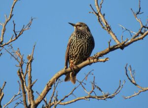Lo storno (Sturnus vulgaris) è un passeriforme di medie dimensioni (21 cm), dal lungo becco, dalle ali triangolari e dall’abito nerastro con riflessi metallici ornato da numerose macchiette bianche. È una specie dalle abitudini spiccatamente gregarie che pascola nelle aree verdi periferiche. È onnivoro e ha una dieta che varia con le stagioni: in primavera si nutre degli invertebrati che trova nel terreno (insetti, lombrichi, chiocciole), mentre in autunno e inverno si nutre di frutta e semi. Di indole gregaria, durante la giornata si possono vedere posati a terra in gruppi sparsi pronti ad involarsi al più piccolo allarme. E proprio il loro volo rappresenta uno degli spettacoli più belli della natura. Al crepuscolo, quando si raggruppano per raggiungere i propri dormitori notturni, si muovono in stormi fitti fino a sembrare delle nuvole nere e si stagliano nel cielo volando compatti uno vicino all’altro. Spesso si possono vedere anche quando compiono delle spettacolari acrobazie, con evoluzioni rapide e fulminee, perfettamente sincronizzate, utilizzate per sfuggire agli attacchi dei predatori (falco pellegrino, gheppio, gabbiano reale).