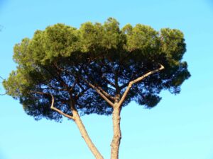 Il pino domestico, o pino da pinoli (Pinus pinea), è molto diffuso in Italia, dove probabilmente venne introdotto dagli Etruschi e successivamente favorito dai Romani. Grazie alla sua vasta presenza, è spesso considerato uno degli alberi simbolo del Paese; non a caso, nei Paesi anglosassoni è conosciuto come “Italian Stone Pine”. Può raggiungere i 30 metri d’altezza ed è facilmente riconoscibile per il fusto diritto e privo di rami nella parte bassa, sormontato da una chioma sempreverde ampia e tondeggiante, sorretta da rami disposti a raggiera, simile a un grande ombrello, da cui l’altro suo nome inglese “Umbrella Pine”. Le sue pigne, grandi e rotondeggianti, compaiono solo dopo il quindicesimo anno di vita dell’albero, ma per gustarne i pinoli occorre aspettare altri tre anni, il tempo necessario affinché maturino. Tra aprile e ottobre le pigne mature cadono al suolo liberando i semi, racchiusi in un guscio legnoso scuro da cui si estrae il pinolo vero e proprio, molto apprezzato in cucina.