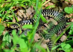 Il biacco (Hierophis viridiflavus), conosciuto anche come “frustone”, è un serpente molto vivace, veloce, particolarmente agile e buon arrampicatore. Se disturbato o infastidito può diventare, però, aggressivo e mordace, anche se non è né pericoloso né velenoso. Al massimo i suoi morsi possono provocare delle leggere ferite cutanee. Il nome scientifico “viridiflavus” deriva dalla sua colorazione verde-gialla su fondo nero delle parti dorsali. Grazie alle sue abitudini poco elusive, non è difficile incontrarlo mentre se ne sta acciambellato in posti ben esposti al sole per raggiungere la temperatura ottimale prima di dedicarsi attivamente alla ricerca di prede. E’ piuttosto robusto e può raggiungere una lunghezza considerevole (fino a circa 180 cm). È una specie ampiamente diffusa e molto adattabile; si rinviene per lo più in aree ben assolate, ma anche in ambienti ruderali dove trova numerose possibilità di rifugio oltre alle sue prede preferite: le lucertole. Comunque, in fatto di alimentazione non fa certo storie nutrendosi praticamente di tutto ciò che gli entra in bocca: insetti, lombrichi, lumache, piccoli uccelli, uova, nidiacei, topi.