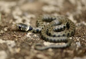 La natrice dal collare (Natrix natrix) si riconosce facilmente grazie alle due macchie nere a forma di semiluna che incorniciano posteriormente due venature bianco-giallastre dietro il capo e che formano il caratteristico “collare” che dà nome alla specie. Il maschio può raggiungere il metro di lunghezza, mentre la femmina, più imponente, arriva anche a 180 cm. È un’ottima nuotatrice e conduce una vita prevalentemente diurna, muovendosi con agilità tra acqua e terra. Abile predatrice, si nutre soprattutto di anfibi, ma cattura volentieri anche pesci e vari invertebrati acquatici; solo occasionalmente si rivolge a piccoli roditori o uccelli. Completamente innocua per l’uomo, anche quando viene molestata raramente tenta di mordere. Se si sente minacciata, preferisce affidarsi a strategie difensive singolari: emette un fluido dall’odore acre e persistente, composto da feci liquide e da una secrezione prodotta da una ghiandola della cloaca, capace spesso di scoraggiare l’aggressore. Se questo non basta, ricorre alla tanatosi, fingendosi morta. Apre la bocca, lascia pendere la lingua, strabuzza gli occhi e inarca il corpo mostrando il ventre flaccido: un espediente impressionante per far credere al predatore di avere davanti una preda in decomposizione e quindi poco appetibile. Una tecnica ingegnosa, che funziona molto bene con cani, gatti e volpi.